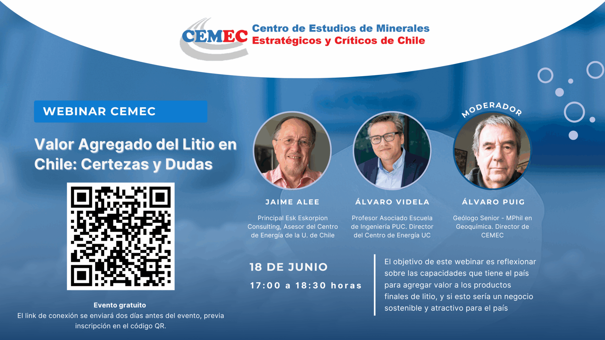 Cemec te invita al webinar: Valor agregado del Litio en Chile: certezas y dudas. Evento totalmente gratuito que tiene como objetivo reflexionar sobre las capacidades que tiene el país para agregar valor a los productos finales de litio, y si esto es un negocio sostenible y atractivo para el país.